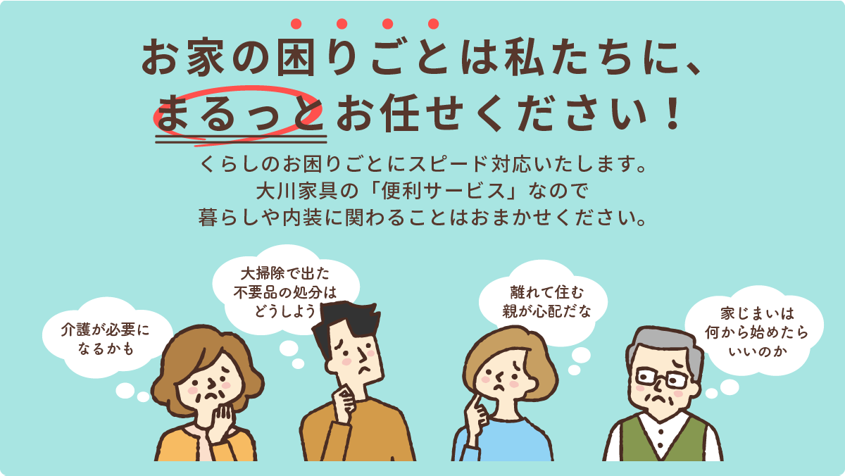 1つのご依頼からさらなるお悩みの解決に向けご提案する事も多くあります。大川家具グループのさまざまな事業をまたぎ、お客さまの「安心」を実現することを目指しています!